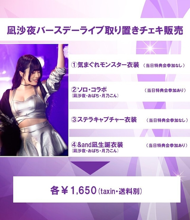 9/7(日)高円寺HIGH開催&and凪沙夜バースデーライブの取り置き通販チェキになります。 シンプル(サイン・お名前・日付入り) 【販売種類】 ①気まぐれモンスター衣装(凪沙夜のみ) ②凪沙夜ソロ・コラボ(凪沙夜・おばち・月乃こん) ③ステラキャプチャー衣装(凪沙世のみ) ④&and凪生誕衣装(凪沙夜・おばち・月乃こん) *②④でグループ撮影チェキご希望の方は各メンバー1枚ずつご購入いただき、備考欄にグループチェキ希望とご記入ください。 【価格】各1枚¥1,650(税込/送料別) 【お申込み】~9/7(日)16時締め切り 【発送】9/8(月)~順次発送 *送料¥500(全国一律)もお忘れなくお申込みください。