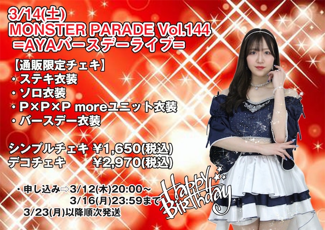 3月14日(土)開催『ステラキャプチャーAYAバースデー』通販限定チェキです。 ・ステキ衣装(バースデー告知画像着用) ・ソロ衣装 ・P×P×P moreユニット衣装 ・バースデー衣装 ●シンプルチェキ 1枚 1650円 日付、サイン付きとなります。 ●デコレーションチェキ 1枚 2970円 日付、サイン、メッセージ付きとなります。 【お申込み】3/12(木)~3/16(月)23:59迄 【発送】発送3/23(月)~順次発送 送料もお忘れなくお申込みください。 ※郵送のみの受付となります。